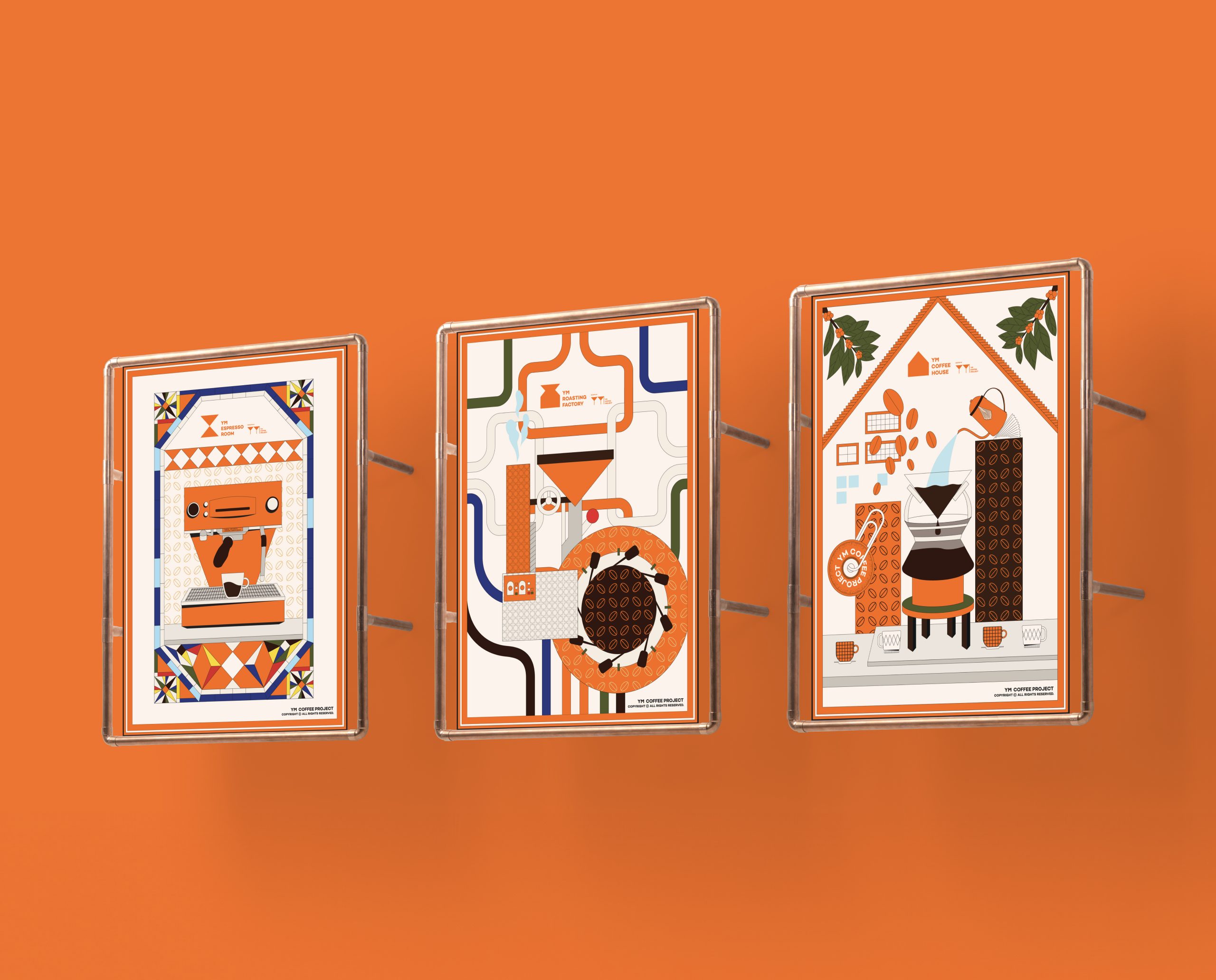 YM COFFEE HOUSE, YM ROASTING FACTORY, YM ESPRESSO ROOM. This is a series of art posters that visually express each identity. YM COFFEE HOUSE pursues only hand drip, YM ROASTING FACTORY does roast coffee beans everyday and YM ESPRESSO ROOM has a espresso machine customized in YM ORANGE color. You can see the identity of each space through Art posters.