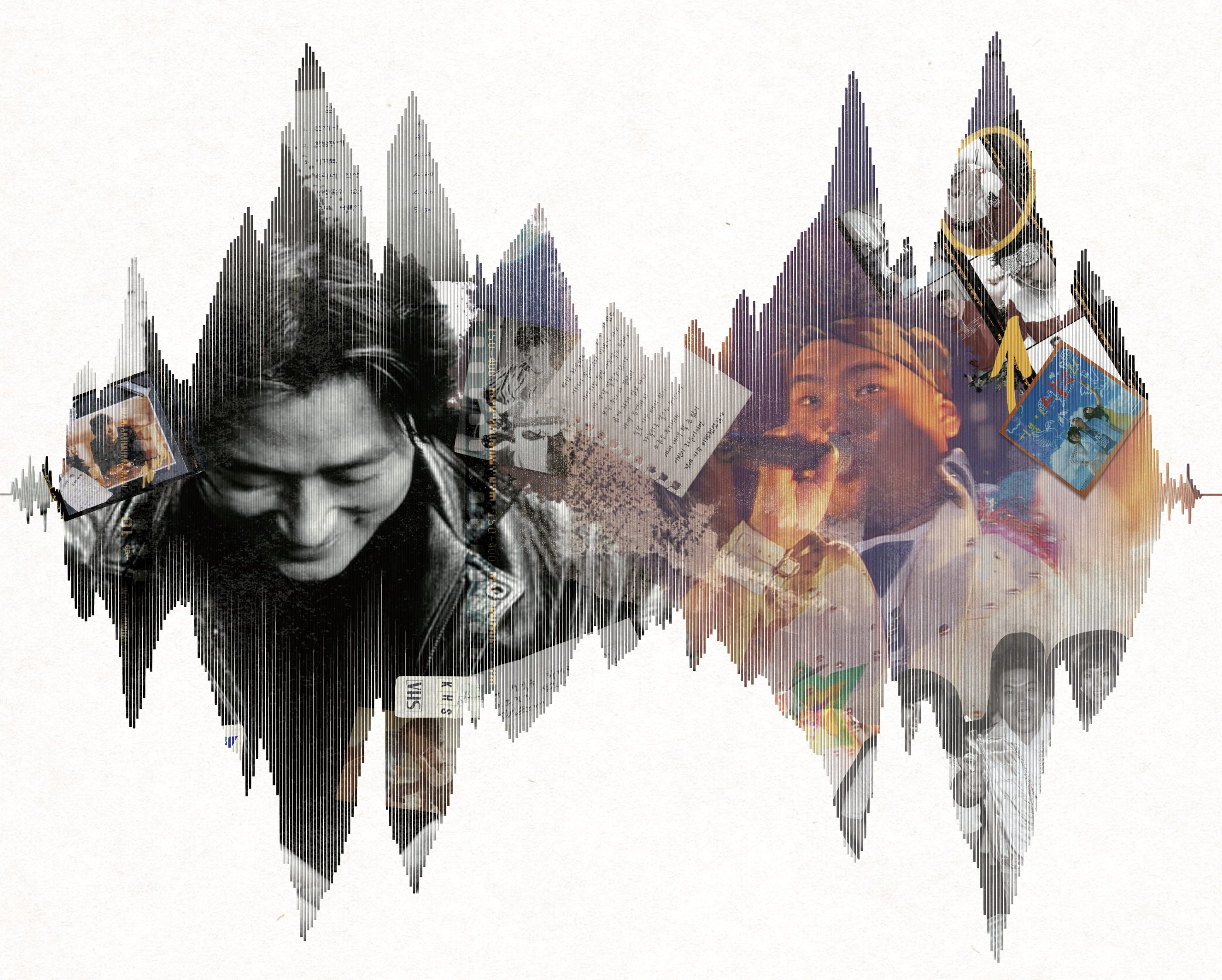 사운드의 파동과 그 파동 사이로 보이는 콜라주 이미지들은